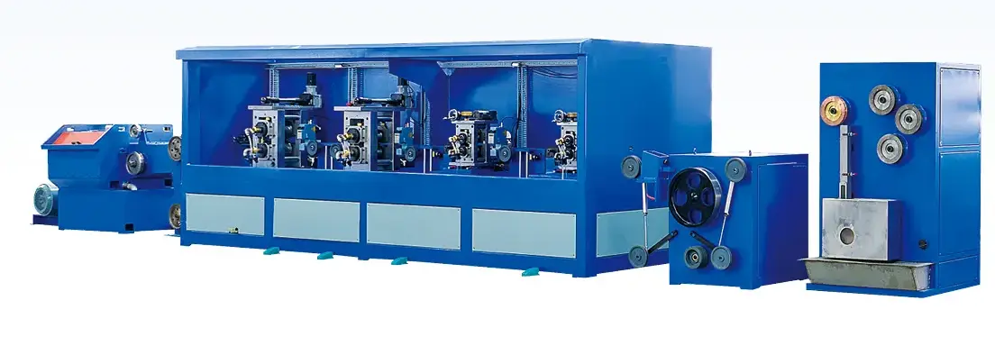 Размотка медной проволоки → Прецизионное волочение → Четырехвалковая прокатка → Онлайн-отжиг → Очистка → Высокоскоростное лужение → Накопление проволоки → Прецизионная намотка на двойные катушки. Также возможно приобретение отдельно прокатного станка для медной проволоки или высокоскоростного станка для лужения шин.